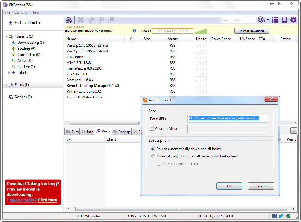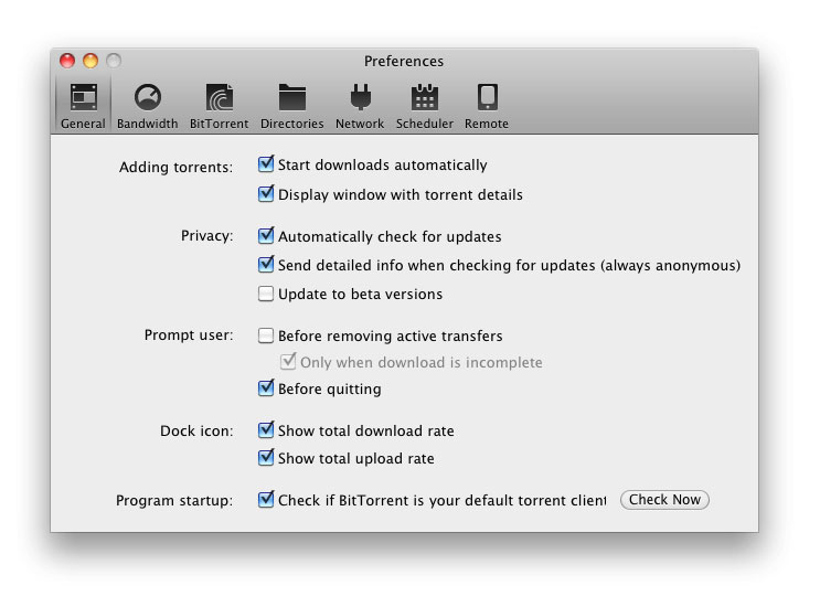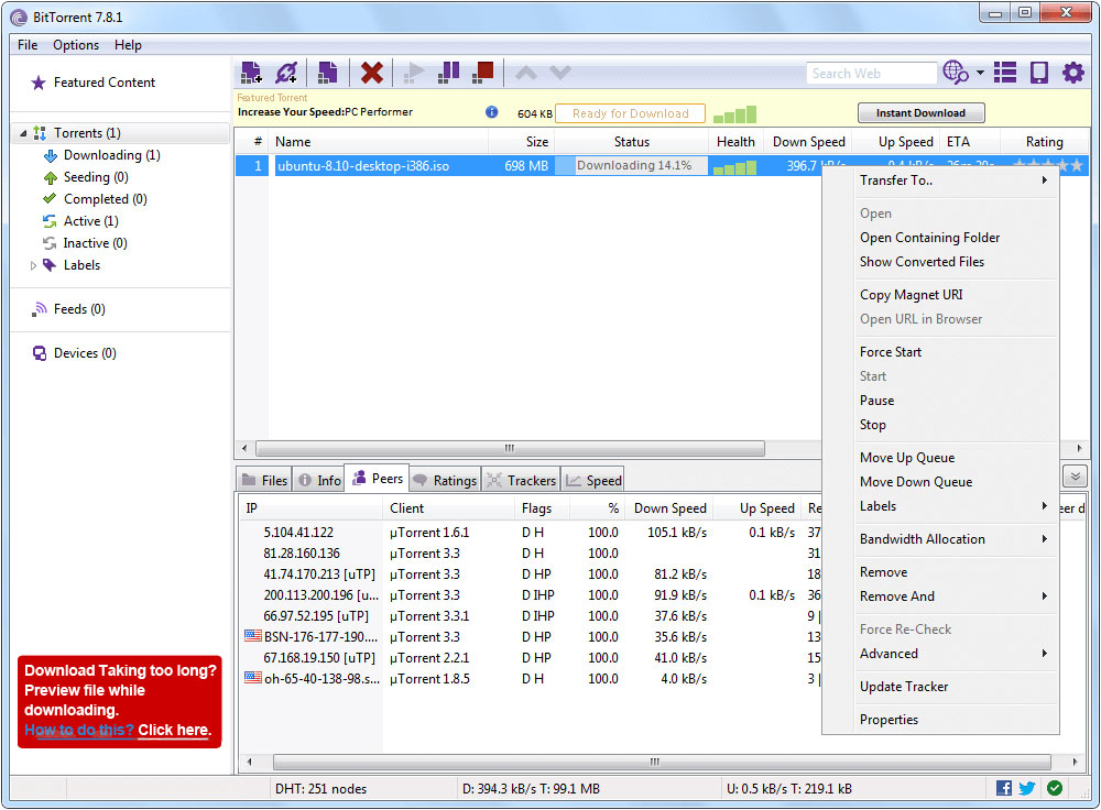 يمكنك ضبط تحميل ملفات تورنت متعددة وسرعة التحميل سريعة بشكل معقول. من السهل إعداد البرنامج ونقترح أن تختار المنفذ المناسب ووضع حدود لمعدل التحميل والرفع لتجنب استهلاك سعة النطاق. من الجيد أيضاً ضبط تنزيلاتك حسب الأولوية لمتابعة سير تنزيل الملفات بشكل أدق.