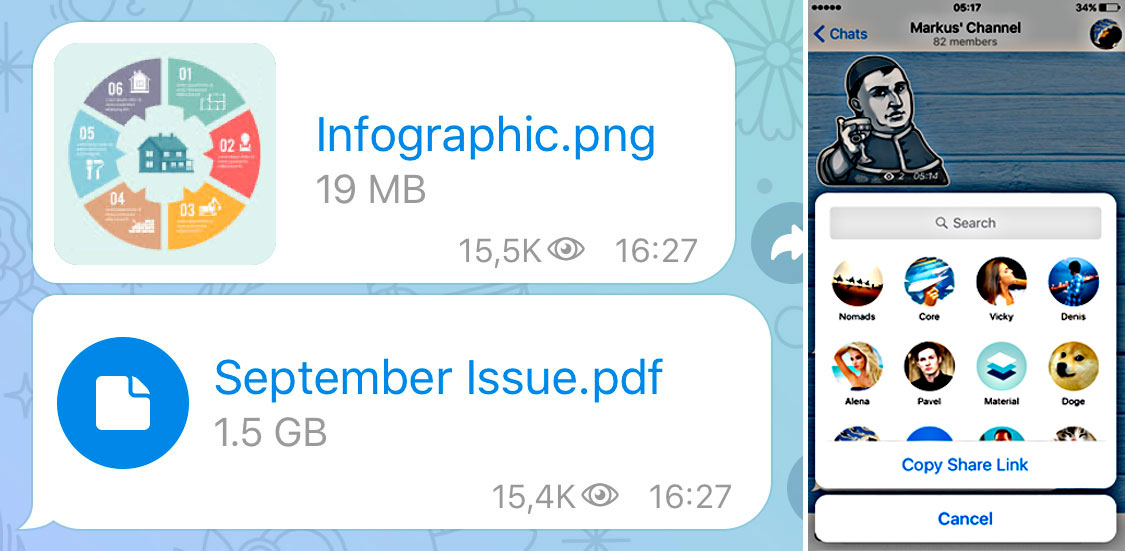 يدعم الإصدار الحديث من تيلجرام كلاً من مكالمات الصوت والفيديو، ويرسل أي نوع من الملفات.