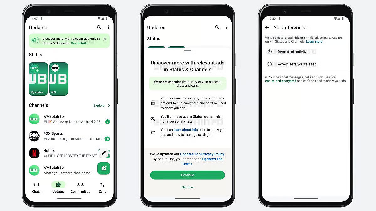أعلنت ميتا منذ أيام أن الشركات ستتمكن الآن من تشغيل ما يُسمى بإعلانات الحالة على واتساب، والتي تُشجع المستخدمين على التفاعل مع المُعلنين عبر ميزات المراسلة في التطبيق. ستظهر الإعلانات للمستخدمين فقط ضمن علامة تبويب “التحديثات” في واتساب لفصل العروض الترويجية عن محادثاتهم الشخصية. بالإضافة إلى ذلك، ستبدأ ميتا بتحقيق الدخل من ميزة قنوات واتساب من خلال إعلانات البحث والاشتراكات.